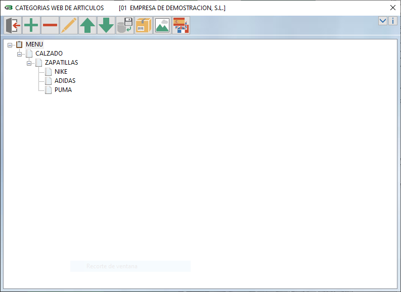 Mediante esta opción podrá definir el árbol de categorías que van a tener los artículos en la web. El elemento principal del árbol se llama MENÚ y no se puede modificar.