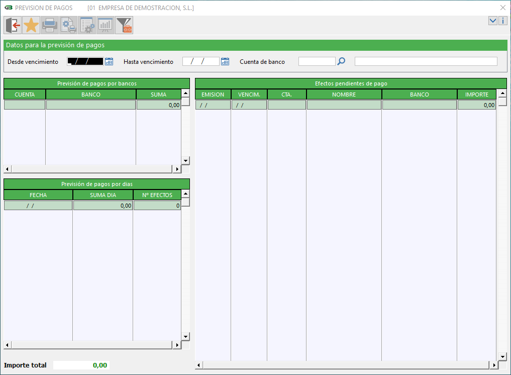 Mediante esta opción podrá obtener un listado de los efectos pendientes de pago contenidos en un margen de fechas y para un banco determinado.