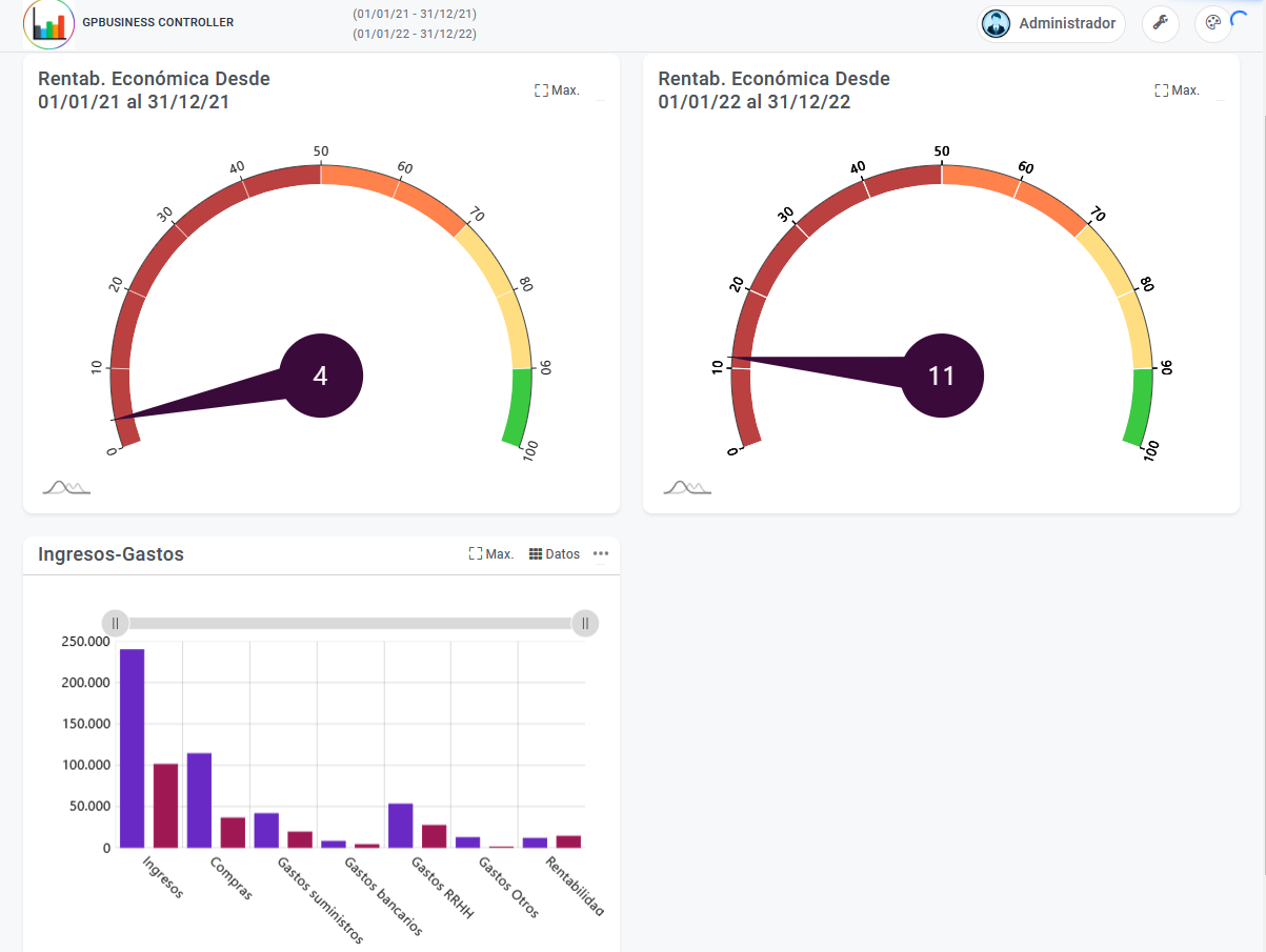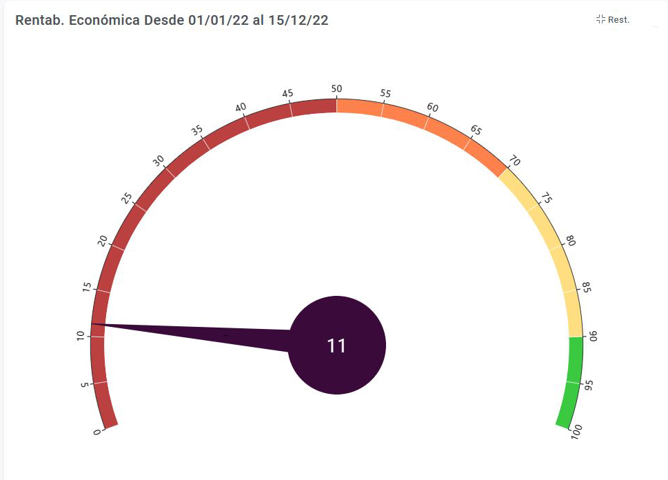 Porcentaje que nos mostrará, en este gráfico, la Rentabilidad de nuestra empresa en los periodos indicados en configuración.El cálculo realizado en esta gráfica es un porcentaje: Rentabilidad= (Ingresos - Gastos) / Activo x 100
