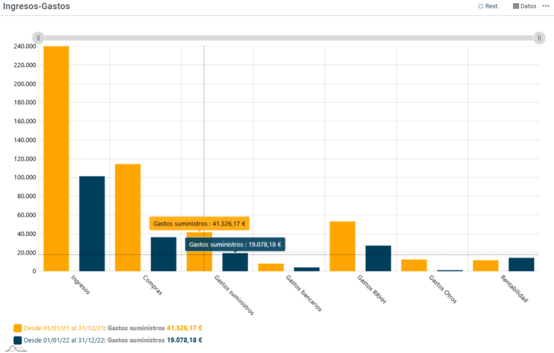 • Gastos: suma de apuntes del periodo indicado para las cuentas 60:61:64:62:68:69