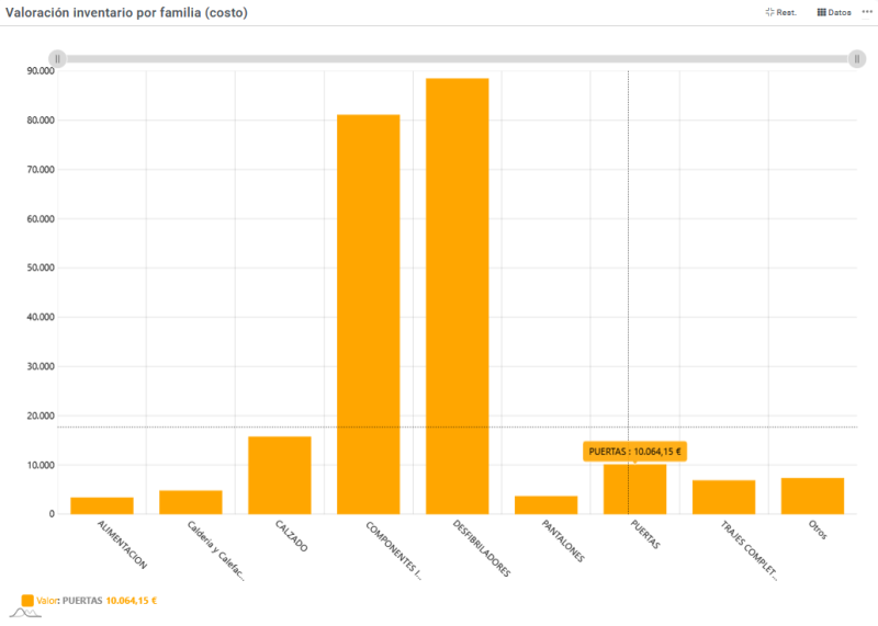 Importe total del stock del conjunto de todos los almacenes (iniciales + entradas - salidas) agrupados por familias. El cálculo está valorado con respecto al precio de costo indicado en la ficha del artículo.