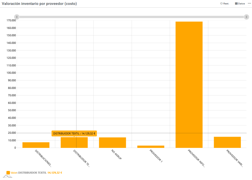 Importe total del stock del conjunto de todos los almacenes (iniciales + entradas - salidas) agrupados por proveedor. El cálculo indicado está tomado con respecto al precio de costo indicado en la ficha del artículo.