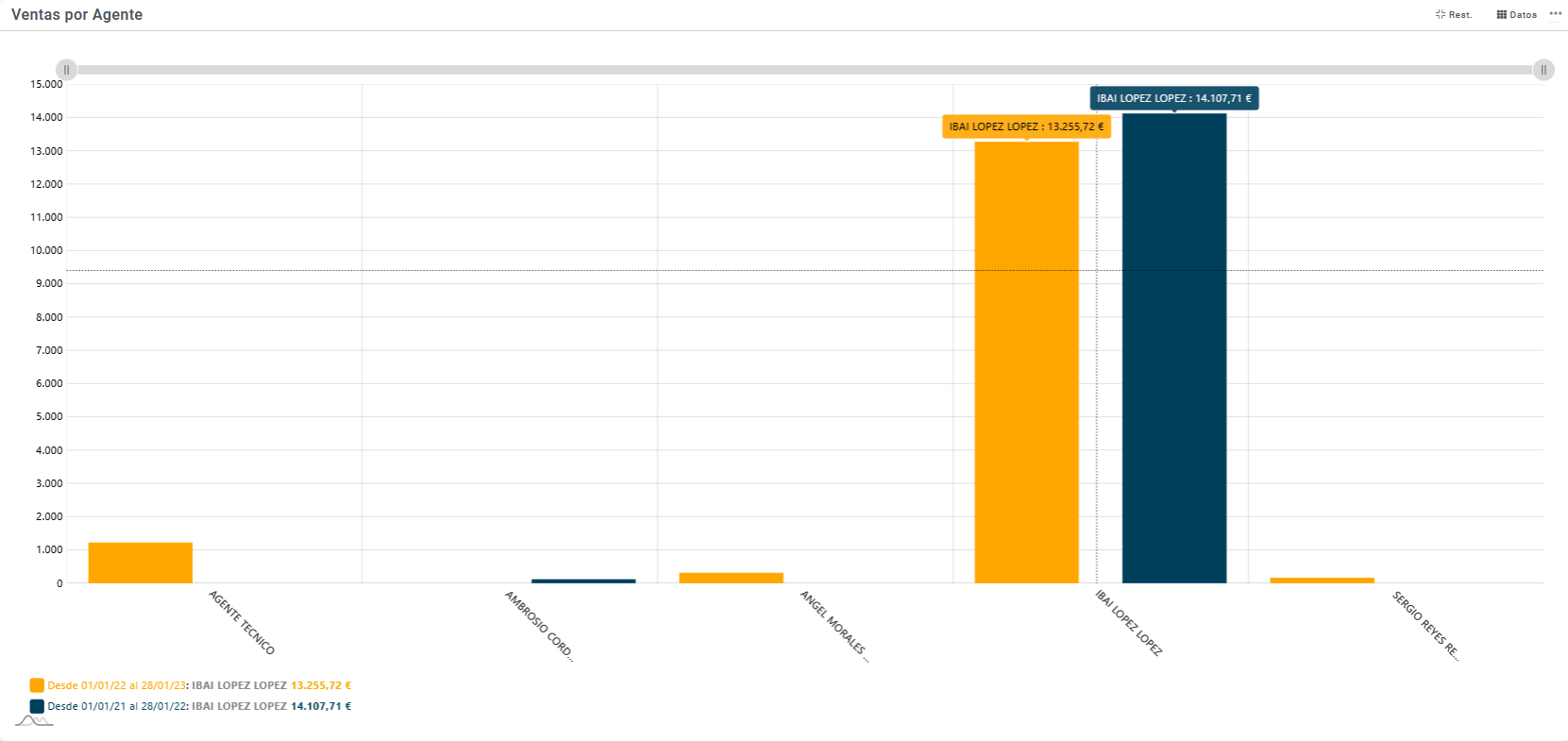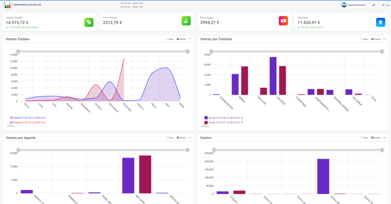 Ventas totales desglosadas por agentes, diferenciando el periodo actual con respecto al periodo anterior. Esta información está recogida de los movimientos de salida en los periodos indicados como actual y anterior diferencias por colores.