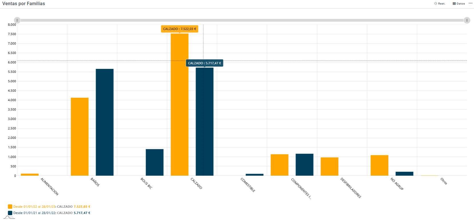 Información referente a la ventas totales desglosadas por familias, diferenciando el periodo actual con respecto al periodo anterior. Esta información está recogida de los movimientos de salida en los periodos indicados como actual y anterior diferencias por colores.