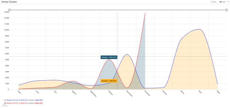 Información referente a la ventas totales desglosadas por meses, diferenciando el periodo actual con respecto al periodo anterior. La información recogida incluye las líneas de movimientos con traspasos y comprobaciones de inventario incluidas.