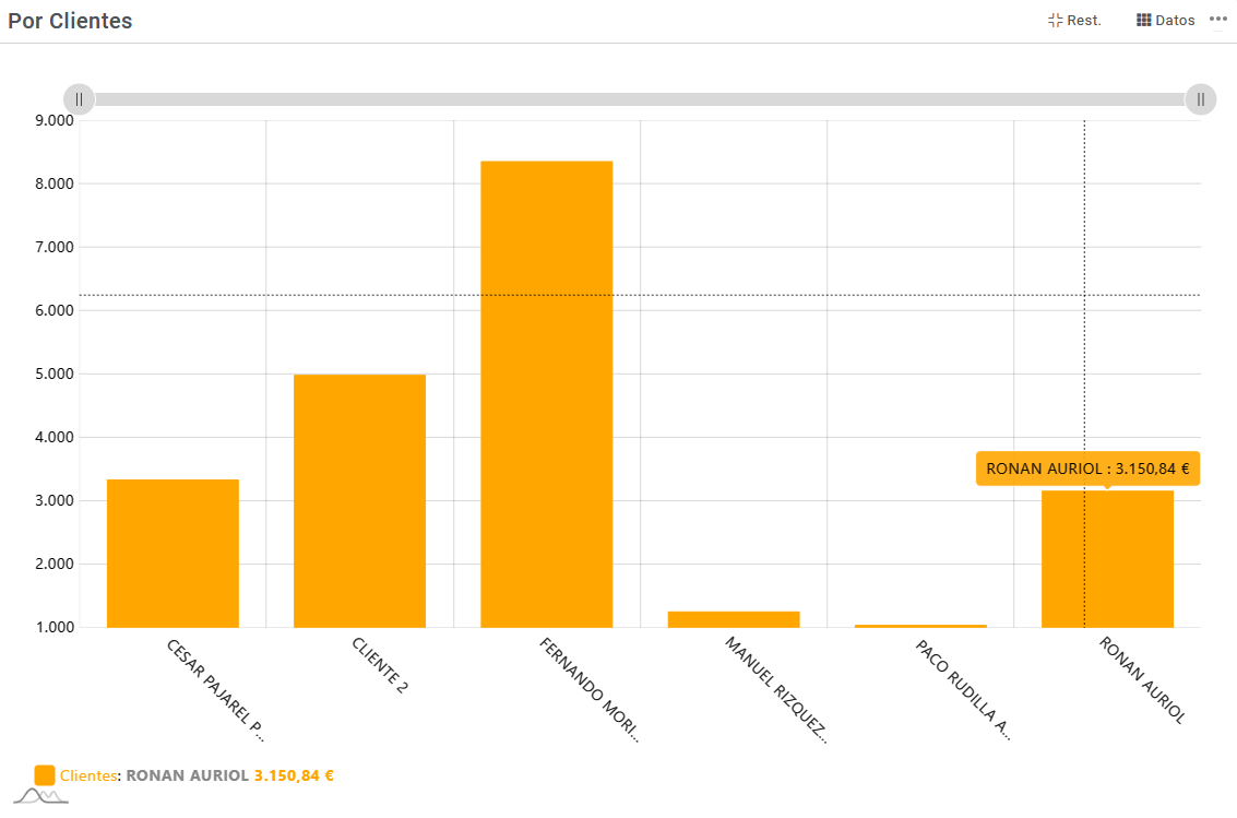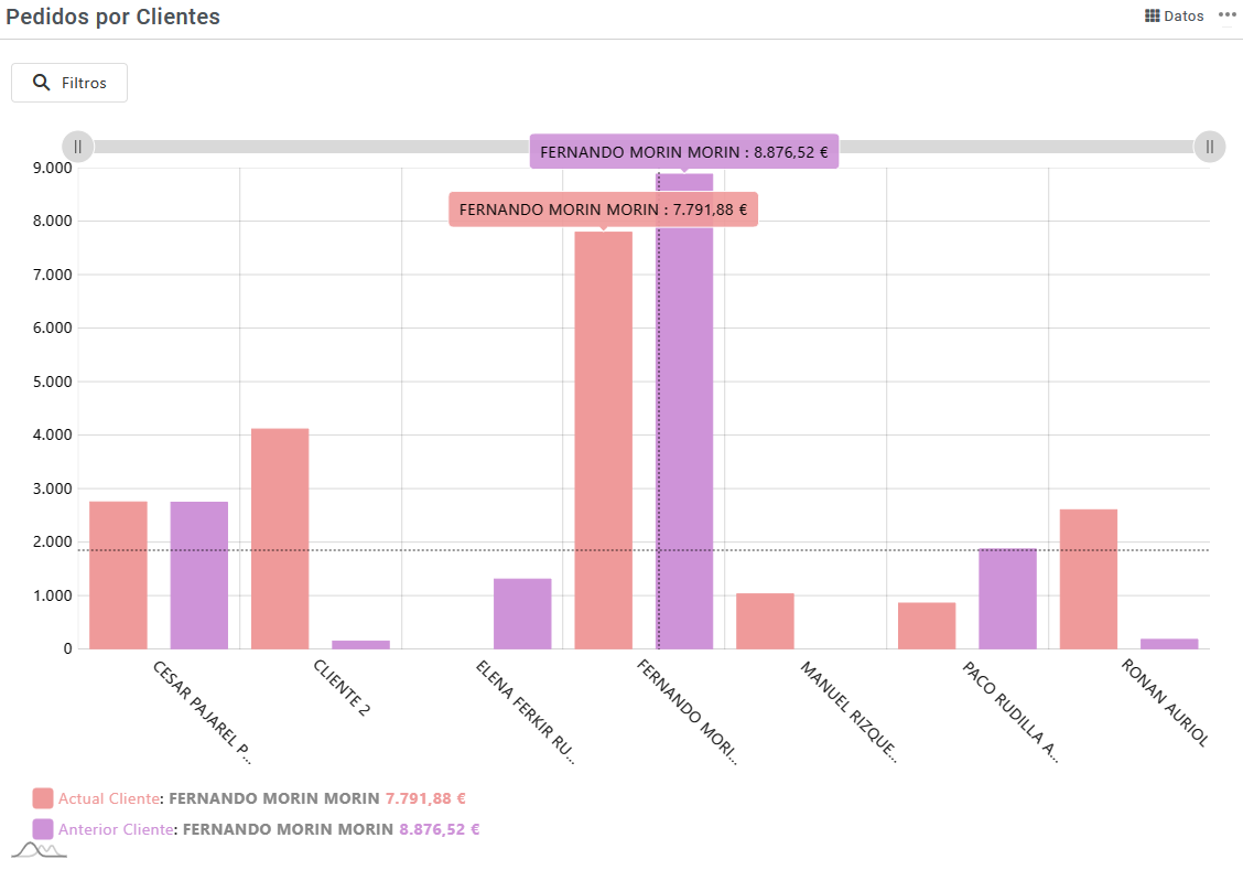 Importe de ventas en pedidos agrupadas por cliente diferenciando entre el periodo actual y el periodo anterior configurados en la aplicación. En está opción podremos realizar filtros sobre la información que nos muestra estos filtros pueden ser: