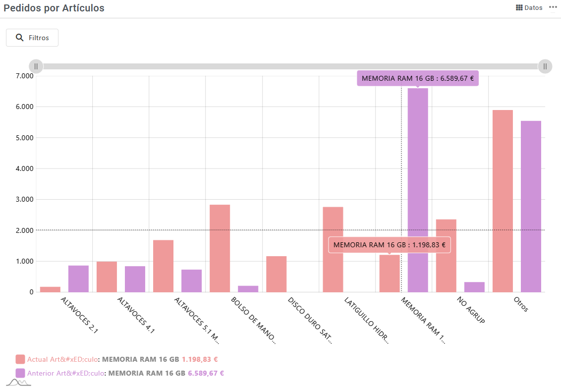 Importe de ventas en pedidos agrupadas por artículo diferenciando entre el periodo actual y el periodo anterior configurados en la aplicación. En está opción podremos realizar filtros sobre la información que nos muestra estos filtros pueden ser: