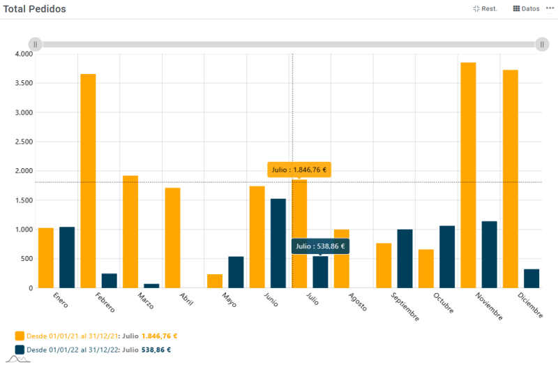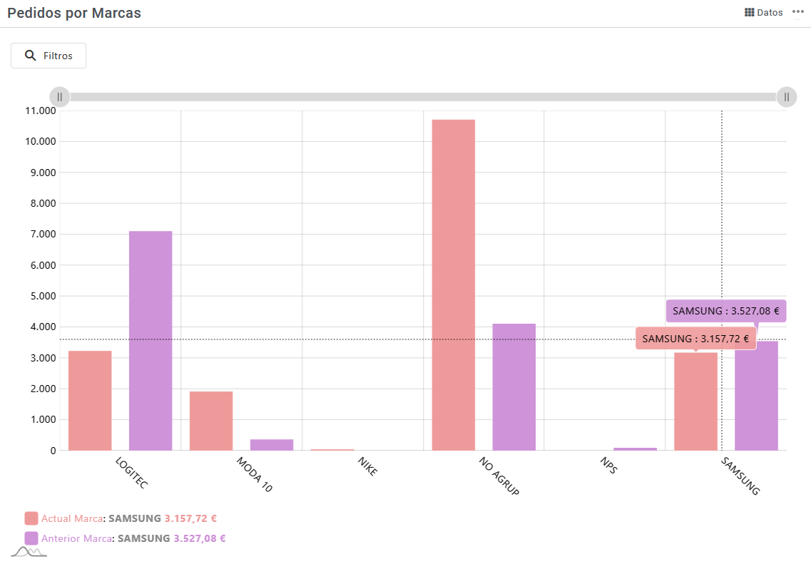 Importe de ventas en pedidos agrupadas por marca diferenciando entre el periodo actual y el periodo anterior configurados en la aplicación. En está opción podremos realizar filtros sobre la información que nos muestra estos filtros pueden ser: