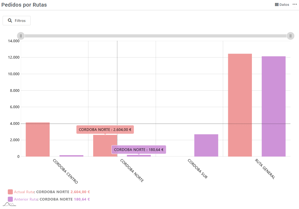 Importe de ventas en pedidos agrupadas por ruta diferenciando entre el periodo actual y el periodo anterior configurados en la aplicación. En está opción podremos realizar filtros sobre la información que nos muestra estos filtros pueden ser: