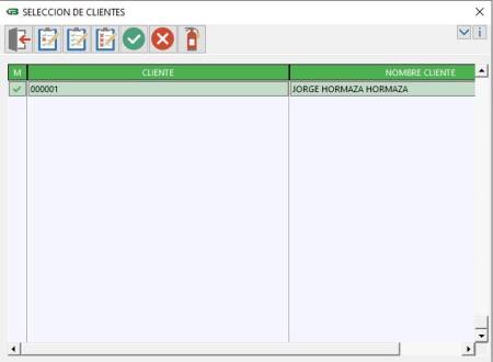 Cuando se pulse aceptar, se mostrará una ventana con todos los clientes que cumplen las condiciones de la toma de datos, se podrá marcar o desmarcar, según se desee: