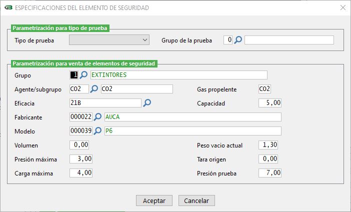 Presión pruebaIntroduzca la presión de prueba que se volcará en el elemento de seguridad al realizar una compra, de no utilizarse dejar a cero.
